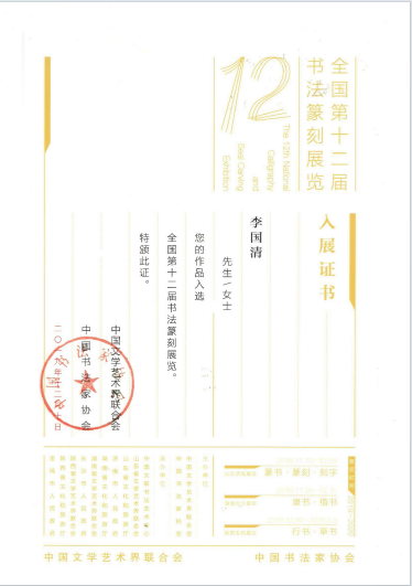 他的书法作品被中国文字博物馆、省美术馆以及兰亭书法博物馆等收藏,在各类国家级、省级展览中获奖、入展更是达百余项,尤其在全国第十三、第十二届书法篆刻展、全国第五届正体书法展、全国第五届青年书法篆刻展、全国第三届篆书展等中国书协重要展览中都有他的亮眼成绩,还荣获全国大中小学教师书法大赛一等奖。