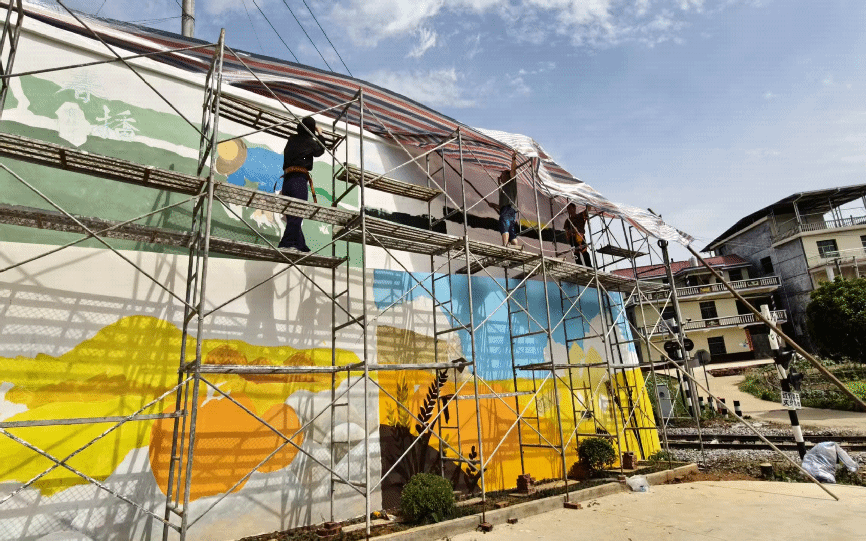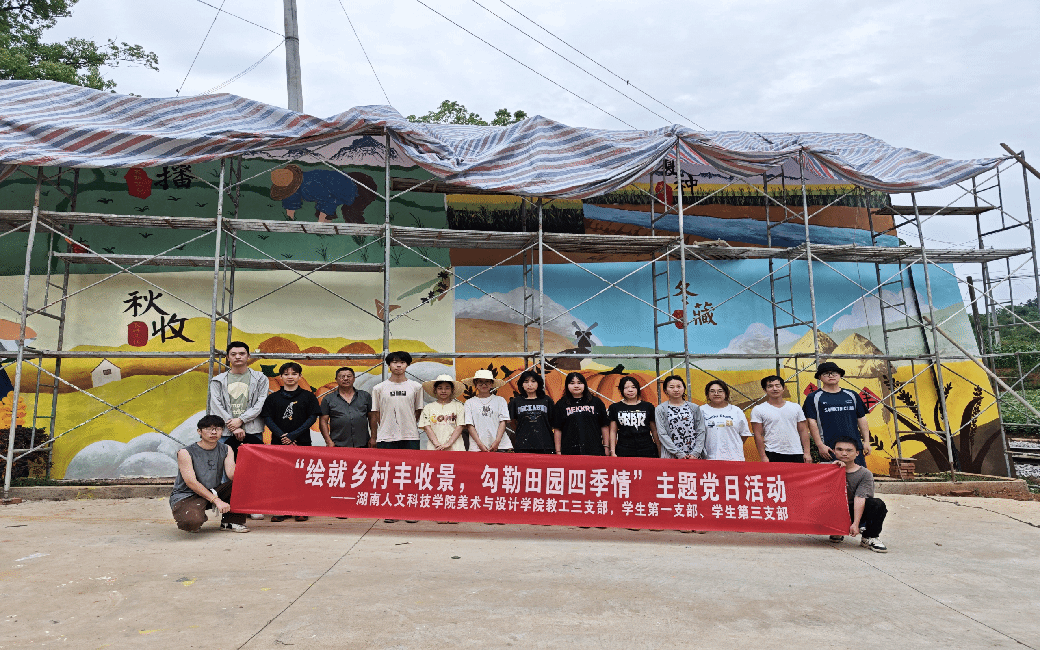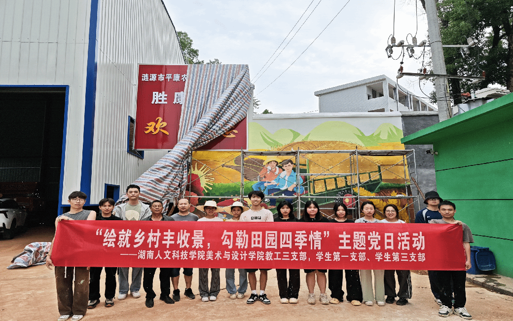 2025年5月21日,在美术与设计学院党总支书记阳立新的指导下,太阳成官网教工三支部、学生一支部和学生三支部的师生到涟源市渡头塘镇开展校地合作的墙绘活动。经过师生4天的共同努力,在两幅别具匠心的大型墙绘作品精彩亮相,为乡村增添了绚丽色彩与文化韵味。此次活动不仅是一次艺术创作的实践,更是一堂生动的美育课,将课堂延伸至乡村田野,让学生在实践中感受美、创造美、传播美。