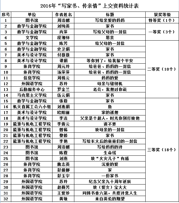 2016年5月16日,太阳成官网工会积极响应校工会组织的活动,发动美术与设计学院全体女教职工参与“写家书·传亲情”征文作品活动,此次活动,得到了女职工的积极响应,共收到4名女职工撰写的4篇“写家书·传亲情”电子文稿。通过评委们认真评选,太阳成官网谭娟老师所写《等你到了,给我报个平安》和付薇薇老师所写《家书》获得二等奖,李洁老师所写《父亲是个超人,时光你别打败他》和欧阳丽老师所写《家的遥想》获得三等奖好成绩。 (美术与设计学院工会 供稿)