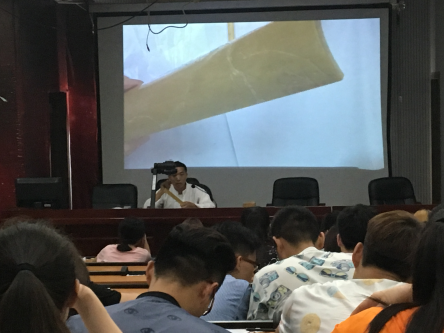 宁亮成老师从竹子的结构、生长习性以及竹子的各种种类进行一一讲解。他指出,当下最为流行的为留青竹刻,和我们书法专业的篆刻大同小异,有着异曲同工之妙,分为阴刻和阳刻,并且结合多媒体为学生进行了图文并茂的讲解。