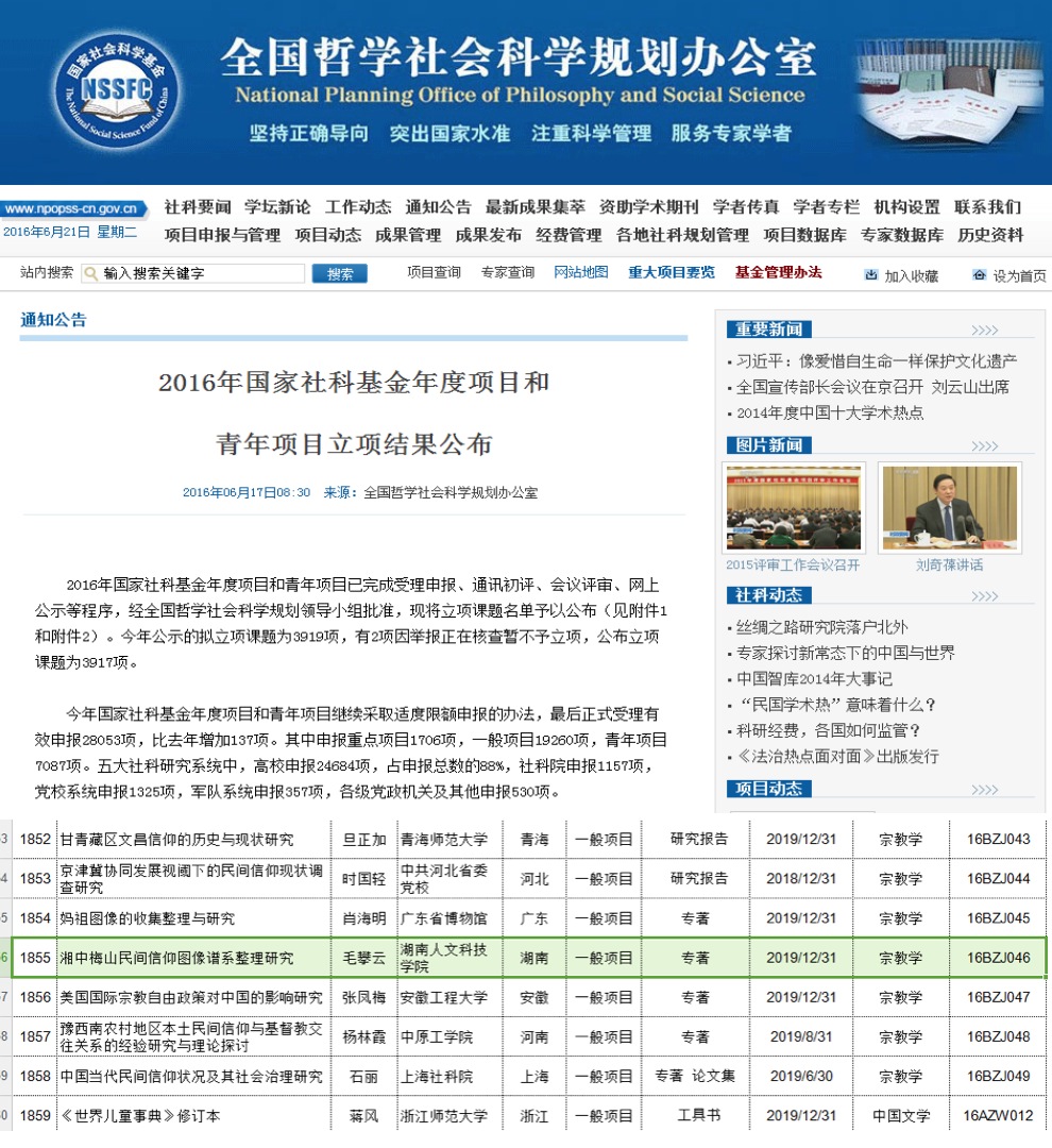 近年来,美术与设计学院致力于学术研究的深化,强调培育学科特色,注重服务地方需求,形成了以梅山文化为核心的系列学术成果,完成了多项服务地方的重大项目。此次,毛攀云副教授主持的“湘中梅山民间信仰图像谱系整理研究”获得国家社科基金项目立项资助,将推动太阳成官网科研水平迈向一个更高的台阶。(院科研办 供稿)