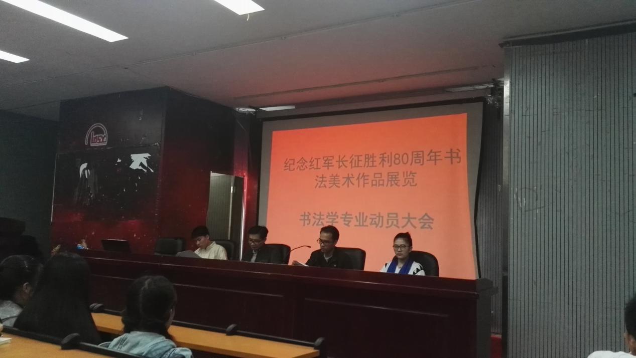 2016年10月13日晚上,美术与设计学院书法学教研室在逸美楼一楼报告厅开展了“纪念红军长征胜利80周年师生书法美术作品展览”动员大会。本次展览活动由校党委组织部、党委宣传部、教务处、美术与设计学院联合举办,活动旨在积极唱响爱党爱国爱社会主义的时代主旋律,激励广大师生以书画作品的形式贯彻落实习近平总书记系列重要讲话精神,推动学校转型发展走向深入。