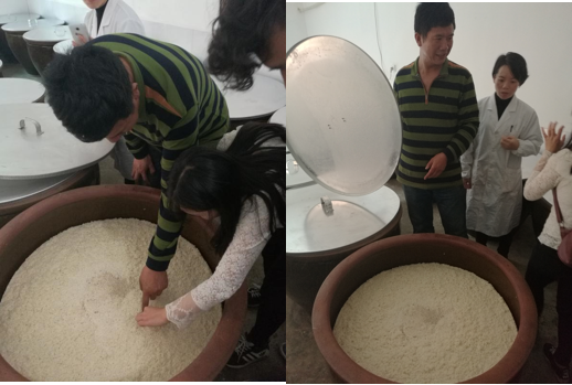 农生院的肖荣博士全程陪同,给大家做了详细的解说,并带领大家参观了她的实验室,让大家观察了不同品种糯米经过发酵之后的不同状态。四个小时的考察过程,同学生们都认真的记录并拍照,收集了大量的资料,从糯米的蒸煮到发酵,到酿造和灌装等,学生们对整个酿酒的过程进行了全面且细致的了解。