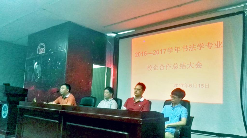 2017年6月16日上午八点半,美术与设计学院书法学专业2017年校企合作总结大会于逸夫楼一楼报告厅落幕。大会由党总支副书记易俊主持,党总支书记谢光绎、教研室主任曾庆勋,带队老师刘风雪、蒋全顺、蒋传存及书法学全体学生参加本次总结大会。
