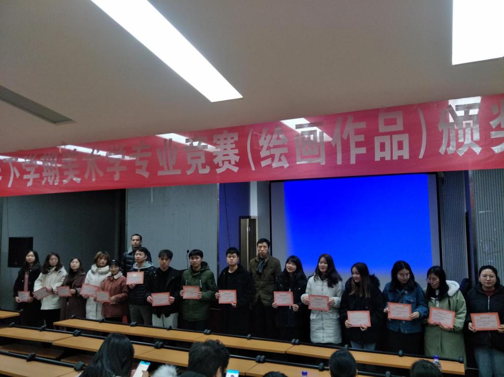 12月18日晚,美术与设计学院一楼报告厅灯火通明、乐曲欢快,现场喜气洋洋,美术学专业第一届美术学专业竞赛(绘画作品)颁奖典礼正在举行。