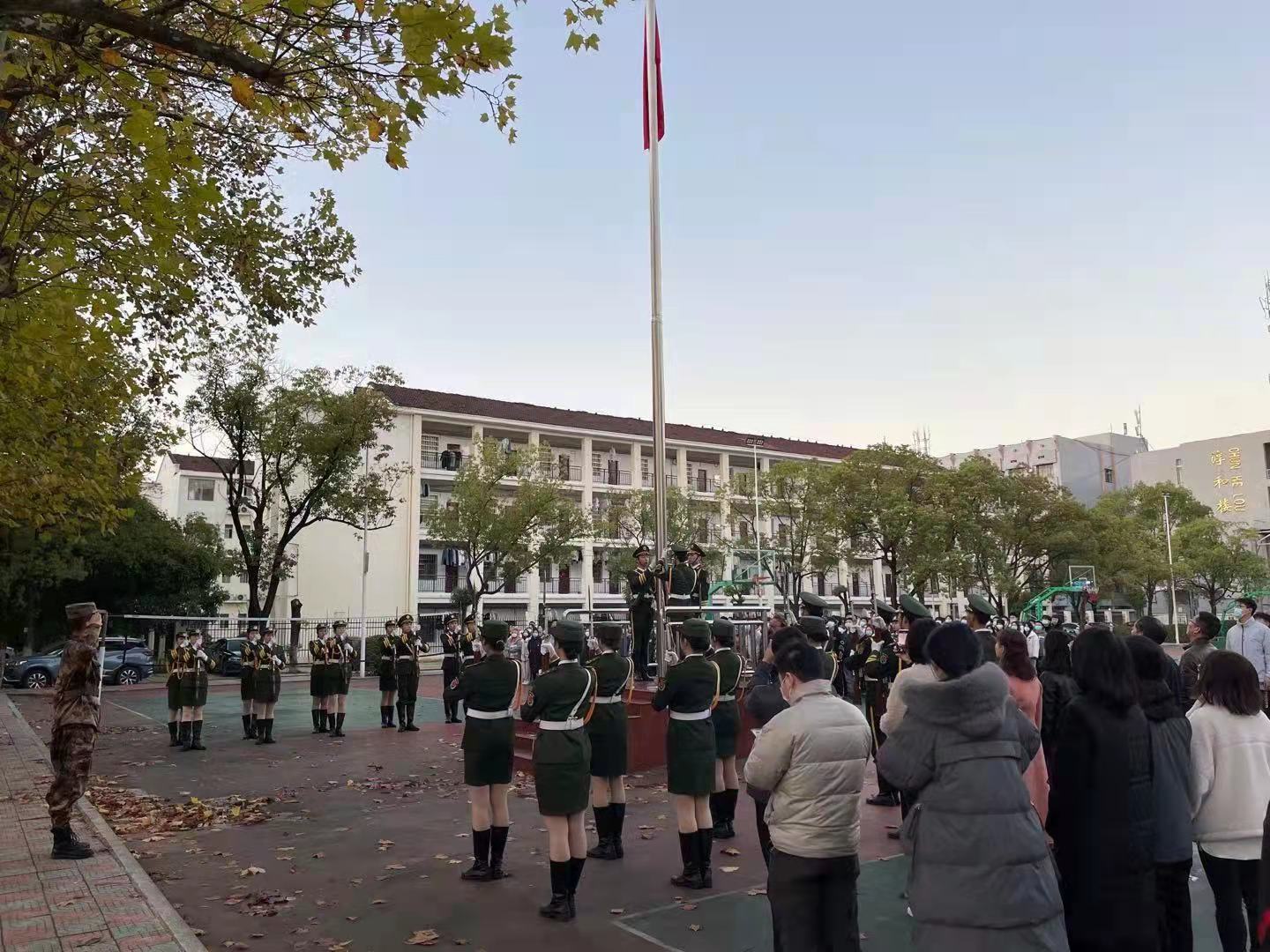6时40分,校国旗护卫队护送五星红旗入场。伴着庄严的《义勇军进行曲》,五星红旗缓缓升起,全体师生在雄壮的国歌中向国旗行注目礼。