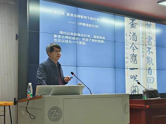 首先,罗红胜由行书的概念引入,从艺术和实用两方面指出了学习行书的意义,并勉励学生要认真对待行书,学好行书。接着,罗教授给大家介绍了行书的分类,还结合自身的经验,详细讲解了学习行书的轨程,特别引用明末清初书法理论家倪后瞻关于学书功夫的三段论,指出学习过程中不同阶段的侧重点及注意事项。接着,罗红胜系统回顾了行书发展演变史,从汉末魏晋质朴的早期行书,到晚清书家寻求新的行书风格突破,娓娓道来,如数家珍。他详细剖析并呈现了王羲之、王献之、王珣、欧阳询、李邕、颜真卿、杨凝式、苏轼、米芾、黄庭坚、赵孟頫、董其昌、何绍基、康有为等行书大家各自鲜明的风格特征。在此基础上,他以《兰亭序》为例,着重跟大家分享了这件尽善尽美之作在笔法、结字、章法等方面的无穷奥妙。