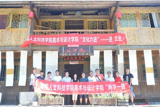 2016年7月30日,在美术与设计学院党总支书记李小林、院长邹少灵的带领下,书法教研室主任兼支部书记易俊,党总支委员刘风雪、蒋传存,美术与设计学院工会主席谭娟,副教授杨竟成,学生党支部书记张晶露,书法学教研室蒋全顺老师及学生党员代表来到新化县文田砚工艺品开发有限责任公司开展美术与设计学院“文化六进”及“两学一做”活动。