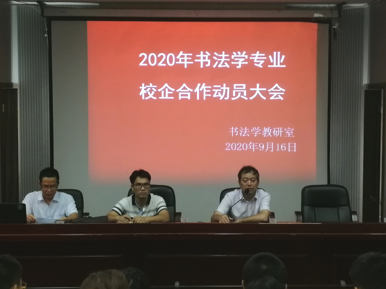 9月16日晚上,书法学专业在美术与设计学院一楼报告厅召开2020年度校企合作暨实习动员大会。书法学专业校企合作带队教师和教育实习指导老师以及书法学专业2017级、2018级、2019级全体学生参加会议,党总支书记谢光绎出席会议并作出指导工作。