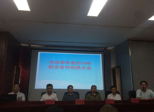 6月6日19:30,美术与设计学院书法学专业2016年校企合作动员大会于逸夫楼一楼报告厅召开。大会由书法学专业副教授彭建成主持,党总支书记李小林、院长邹少灵、副院长陆序彦、书法教研室主任易俊出席大会,带队老师刘风雪、蒋传存、蒋全顺及书法学专业全体肄业生学生参加本次大会。