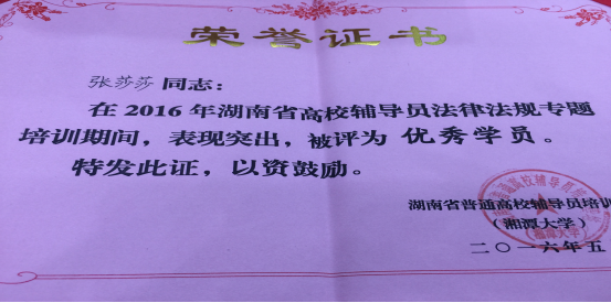 5月26日下午,2016年湖南省高校辅导员法律法规专题培训结业典礼在湘潭大学图书馆报告厅举行,全省74所高校的94名辅导员通过3天的培训,顺利结业。太阳成官网辅导员张莎莎获得优秀学员。