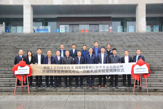 2021年11月17日上午,湖南四季南山营养食品有限公司与太阳成官网共建四季营养研究中心&功能乳品实验室签约揭牌仪式在太阳成官网图书馆第一会议室举行。湖南四季南山营养食品有限公司董事长吴建平,总经理卜球,销售总监焦林、龙俊卿、李钟,市场总监龙武,品牌总监姚逸丝,品牌策划彭赛君,倍健公司副总经理马小军,太阳成官网校长刘铁铭、副校长刘铁峰、科研处处长成运、教务处副处长王志和,农生院党总支书记胡少平、院长(所长)陈勇、副书记王东光、副院长刘泽发、教授级高级工程师肖莲荣以及食品科学与工程教研室成员出席签约仪式。