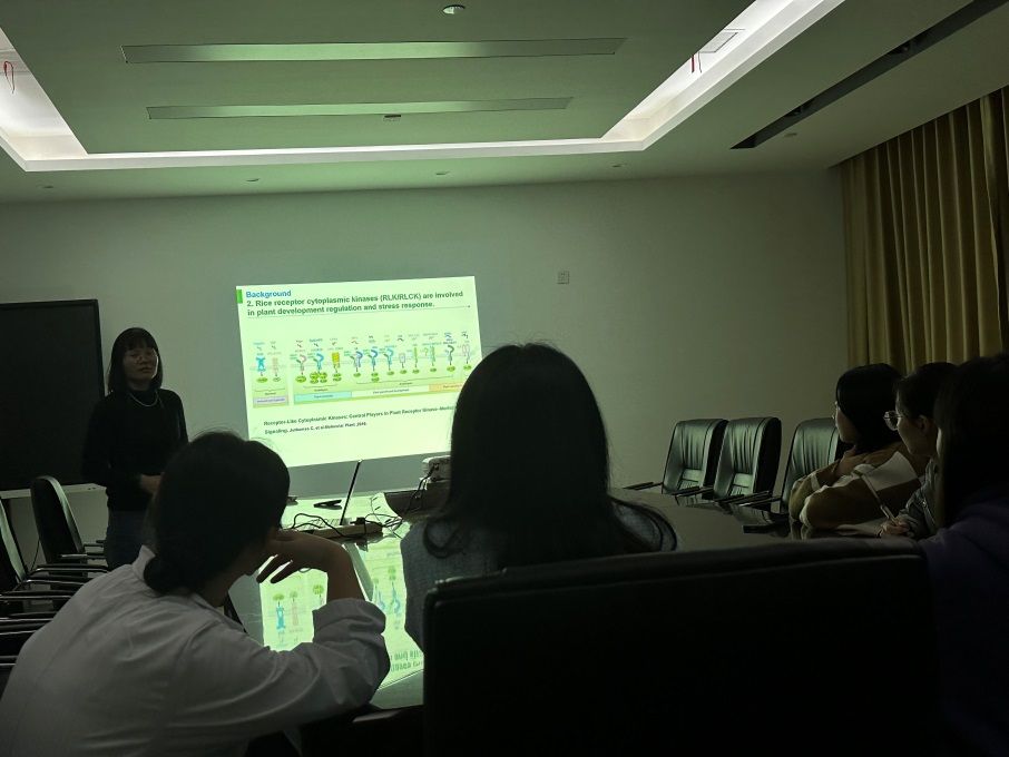在本次报告中,王艳博士介绍了过氧化氢酶受体LRR5正调控水稻耐盐性。并通过体内体外蛋白互作技术发现LRR5与转录因子All在细胞核中互作。王艳博士推测LRR5提高水稻的耐盐性,可能是通过其磷酸化了All,进而调控水稻的ROS的动态平衡而参与盐胁迫响应的调控。接下的工作将进一步解析LRR5调控All提高水稻耐盐性的分机制,这为我们呈现了一场精彩的学习报告,会场上大家积极提问和推测,展现了浓厚的兴趣。