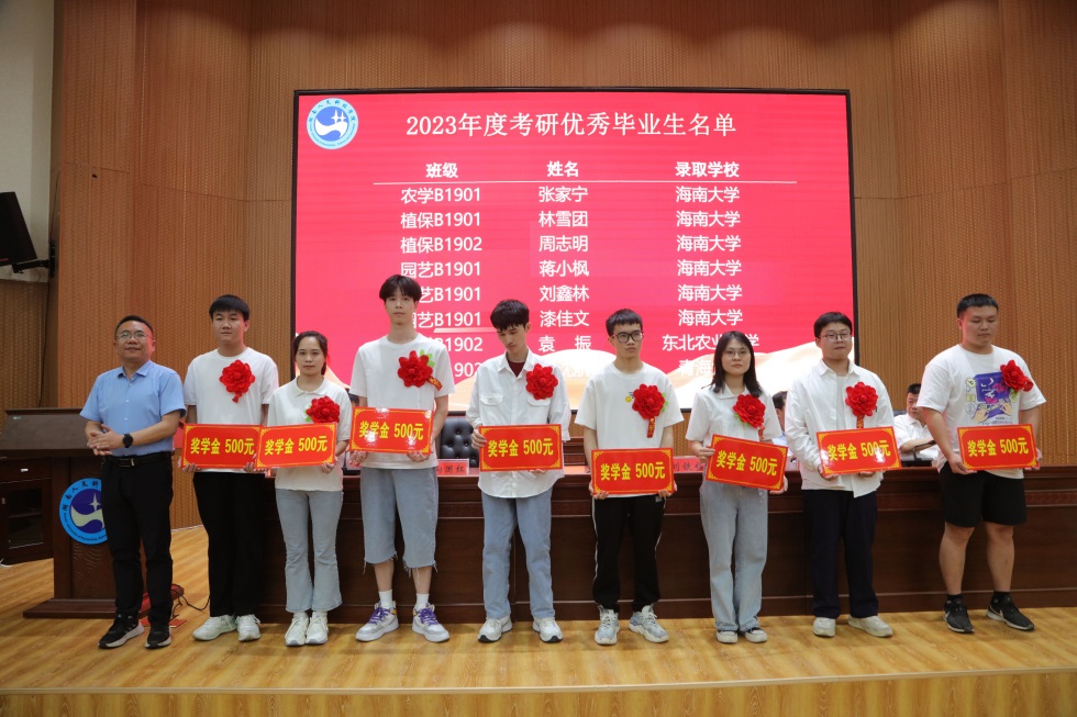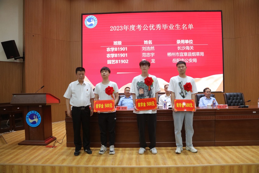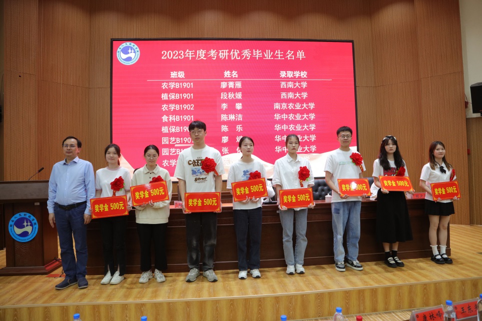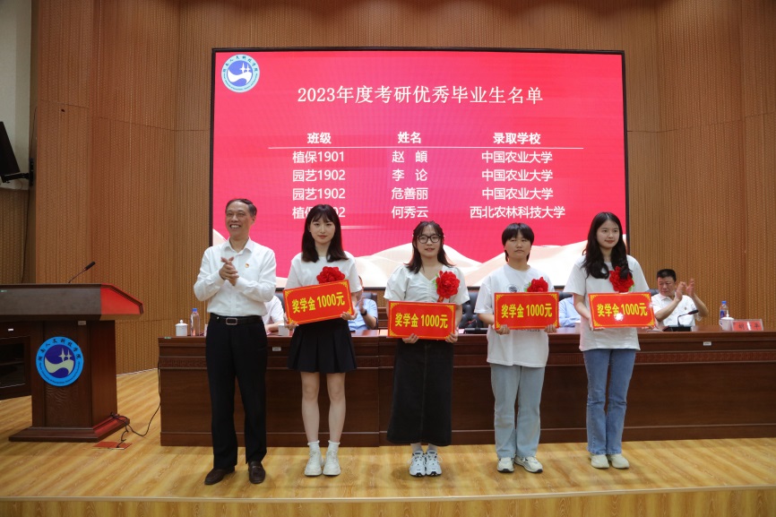 颁奖环节,党委书记刘铁铭欣然为4位考上985高校硕士的优秀学生颁奖。副校长刘建勋、教务处处长向国红、农生院党支部书记胡少平分别为16位考上211高校硕士优秀学生、3位考公学生颁奖。