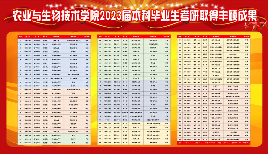 副院长刘泽发作农业与生物技术学院考研考公总结汇报。农生院2023年考研在数量和质量上再创新高。2019级257位毕业生,参加考研161人,考研参考率达到63%,上线92人,最终录取85人。毕业生中考研录取达33.1%,较2022年增加5.26个百分点。在数量上,考研录取率首次突破30%。2019级食品专业较去年更是增长1倍。2019级职高对口班共70人、考研录取率达到了24.3%。在质量上,实现了新的跨越。35人考上双一流高校,其中985高校4人:中国农业大学3人、西北农林科技大学1人;西南大学、南京农业大学、华中农业大学、东北农业大学等211高校20人。上岸85人中,考上外校77人(占90.6%);考上本校8人(占9.4%)。与此同时分析了近三年的报考率及考生成功率数据,为现场即将考研考公的20级学生们树立了更坚定地信心。