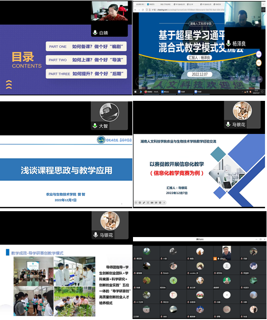 为进一步促进教师有效开展教学,提升课堂教学效果,提高人才培养质量,12月7日下午,农生院在腾讯会议平台开展提升教师教学能力集中培训活动,学院全体专任教师参加。本次培训交流活动,邀请到白婧、杨泽良、曾智、马银花四位博士为大家做教学辅导讲座,他们主讲的题目分别是如何上好一门课?基于超星学习通平台的混合式教学模式探索与实践、浅谈课程思政及教学应用、以赛促教开展信息化教学(以信息化教学竞赛为例)。