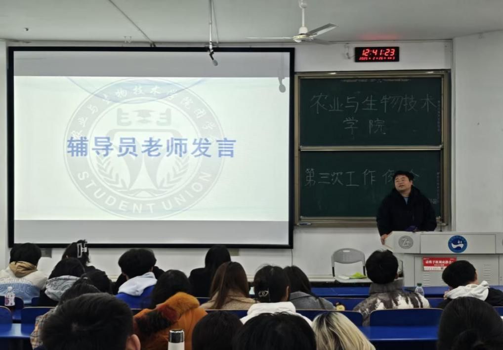 为总结上学期的工作成果,部署新学期工作计划,农业与生物技术学院团学会于2月26日中午在致远楼119教室召开第三次工作例会。出席此次会议的有:全体辅导员老师、团学会主席团、各部门部长及全体志愿者。此次会议共四项议程。