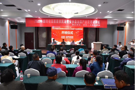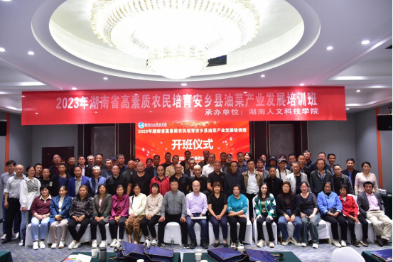 11月3日下午,农生院承办的2023年湖南省高素质农民培育安乡县油菜产业发展培训班在富士国际酒店会议中心正式开班。农生院党总支书记胡少平,安乡县农业农村局农技推广中心主任周精华出席,安乡县农业农村局科教站站长刘慈明、副站长皮春香,黄山头镇农技站站长李建安,带班老师李红建、敬媛蓉,来自安乡从事稻油生产的种植大户、农业龙头企业、农民专业合作社负责人或管理人员,以及新闻媒体记者共70多人参加了开班仪式。仪式由项目负责人朱赞江主持。
