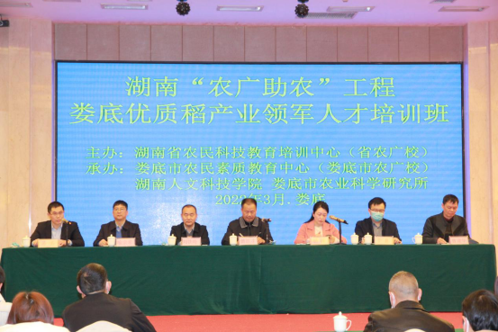3月5日上午,湖南“农广助农”工程娄底优质稻产业领军人才培训在豪莱雅金和酒店4楼会议中心举行开班典礼。湖南省农民科技教育培训中心主任(省农广校校长)傅胜才、副主任(副校长)喻宗希,娄底市委农办主任、市农业农村局党组书记、局长杨萍,市局工会主席、市农民素质教育办公室主任、四级调研员曾建华,44118太阳成城集团党委委员、副校长刘铁峰,校地校企合作处处长于意,农业与生物技术学院院长、农科所所长陈勇等领导出席。来自娄底市各县(市、区)的种粮大户、农民专业合作社、农业龙头企业负责人或技术人员以及省农广校、市农业农村局科室负责人,项目组工作人员、媒体记者共90余人参加了开班仪式。仪式由陈勇主持。