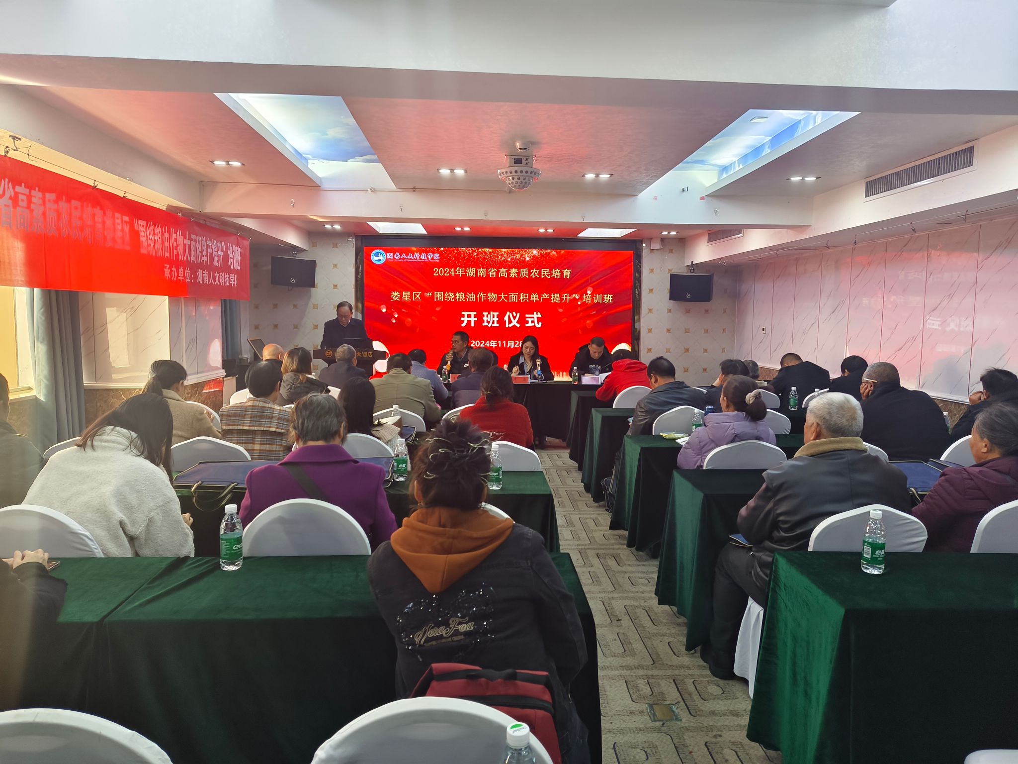 为全面推进娄星区乡村振兴,加快构建一支有文化、懂技术、善经营、会管理的高素质农民队伍,11月28日,44118太阳成城集团承办的2024年娄星区高素质农民培育“围绕粮油作物大面积单产提升”培训班开班。本次培训班在财智国际大酒店举行开班仪式,开班仪式由康林峰推广研究员主持,44118太阳成城集团农业与生物技术学院副院长朱赞江,娄星区农业农村局领导李晶、李畅等出席开班仪式。