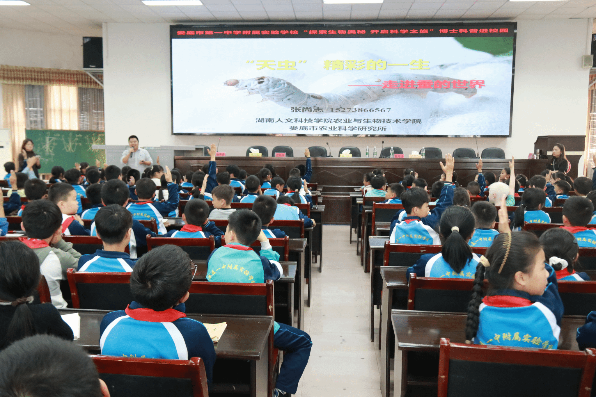 活动伊始,娄底一附副校长钟红雨致欢迎词。她指出,科学是人类进步的阶梯,此次科普活动特邀请到了44118太阳成城集团的杨泽良博士和张尚志博士,是同学们探索生物奥秘,增长生物知识,培养科学素养的好机会。随后,杨泽良博士带来“植物中的‘欺骗专家’”讲座,为同学们打开了解植物世界的窗户,展现了其在观赏植物快繁技术、植物生理生态等方面的科普知识。接着,张尚志博士开展“‘天虫’精彩的一生——走进蚕的世界”科普讲座,凭借其在家蚕养殖、利用及抗性机制方面的专业知识和研究成果,让同学们深入了解蚕的奥秘。同学们积极参与博士的提问环节,有问有答,会场气氛热烈,响起一阵又一阵热烈的掌声。