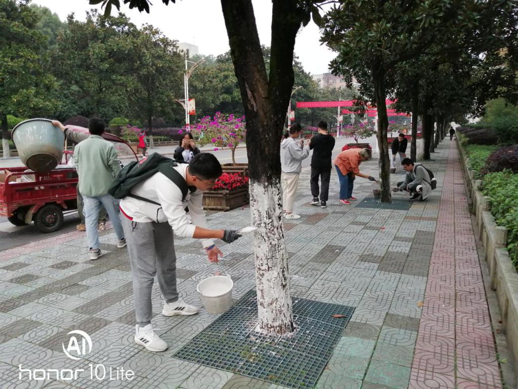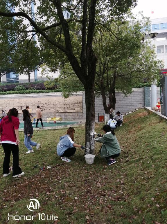 11月6日,为同学们积累园艺园林知识,为就业创业规划作辅垫,培养创新意识,助力创新创业成长成材,农生院组织植保一、二班,农学一、二班,园艺一、二班共200多名学生分批对校内行道树、海园广场和强毅楼周边的树木进行刷白。
