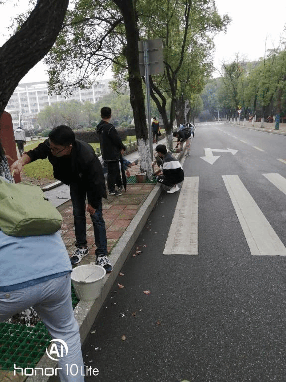 早上8时半,同学们早早地来到8栋宿舍前。园林绿化实训中心主任彭日民老师就有关涂白剂的使用、刷白操作技术和注意事项作了说明。同学们分组在老师们的指导下,充分发挥团队精神,男生提桶,女生拿刷,互帮互助,为行道树齐腰高1.2米刷白。一桶桶石灰浆、一双双手套、一柄柄毛刷,劳动场面热火朝天。通过刷白措施能使树木有效地起到防虫、防病、防菌、防日灼、防冻、防止水分散失、延迟萌芽并顺利越冬的作用。活动至下午6时许方结束,东珠大道、学海路、北山路、书山路、翠竹路行道树,海园广场、强毅楼院内树木面貌焕然一新。