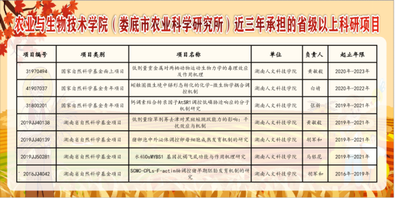 (5)湖南省农田杂草防控技术与应用协同创新中心,为我国农田杂草综合防控技术的可持续发展提供理论、技术、产品和人才支撑。经过5年建设,中心2019年通过上级验收合格,正式挂牌运行,为学科和专业发展提供人才与平台支撑。