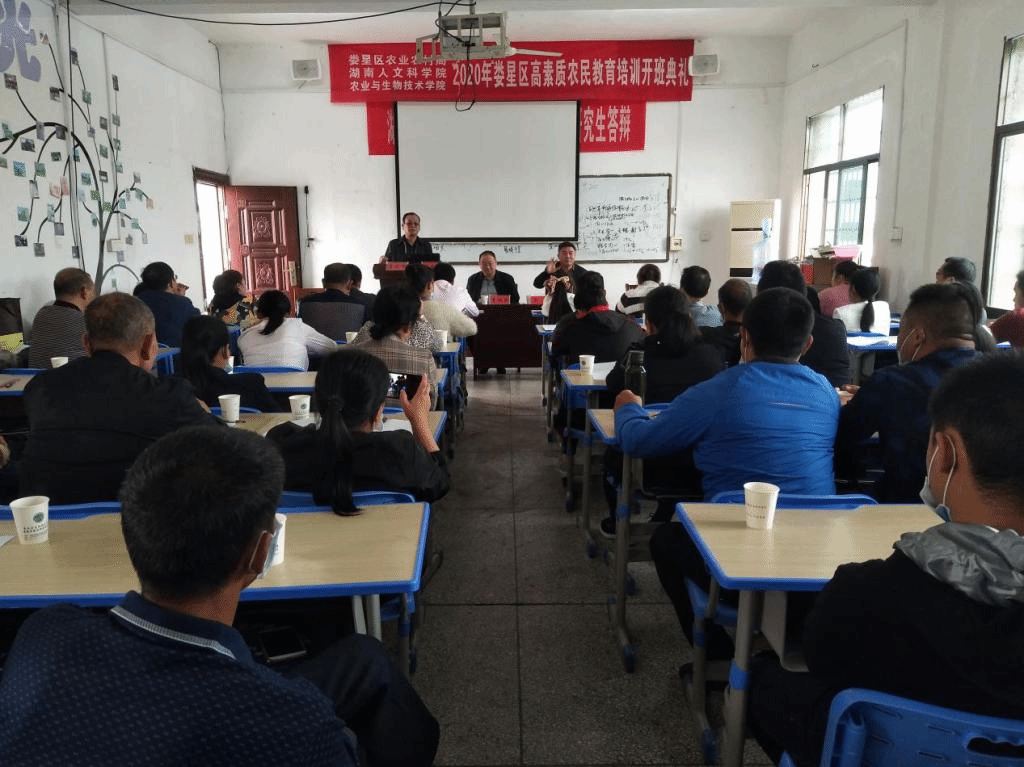 9月23日上午,娄星区2020年高素质农民教育培训“新农商带头人”班在农生院强毅楼601室正式开班。娄星区农业农村局党委书记黄明、办公室、科教股负责人,农生院副院长(农科所副所长)康林峰,班主任、辅导员老师50名农民学员参加了开班仪式。会议由农生院副院长(农科所副所长)康林峰主持。