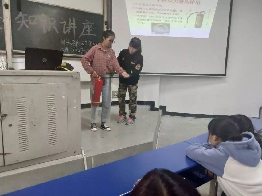 期间介绍了学校报警电话为8375110、学校相关火灾事例、火灾中使用手帕逃生时的注意事项、防毒面具使用方法展示、安全指示灯相关问题、报火警时的注意事项、常见灭火器的种类及使用方法和注意事项、消火栓的使用方法及注意事项,最后对火灾相关知识进行提问、同学们积极配合主讲师完成相关操作,回答火灾知识问题,给讲座画上一个圆满的句号。