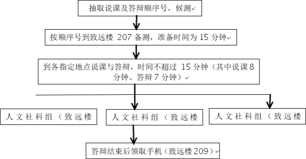 抽取说课及答辩顺序号,候测。按顺序号到致远楼 207备测,准备时间为15分钟。到各指定地点说课与答辩,时间不超过 15分钟(其中说课8分钟、答辩7分钟)