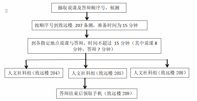 抽取说课及答辩顺序号,候测。按顺序号到致远楼 207备测,准备时间为15分钟。到各指定地点说课与答辩,时间不超过 15分钟(其中说课8分钟、答辩7分钟)