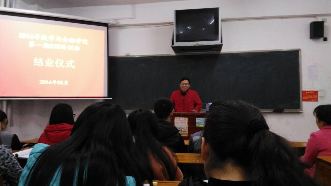 3月14日晚7:30,数学与金融学院在致远楼405教室举行了第2期SYB创业培训结业典礼。数学与金融院党总支高平、学校招生就业处谭芳柳老师、班主任陈芳老师参加了结业典礼。