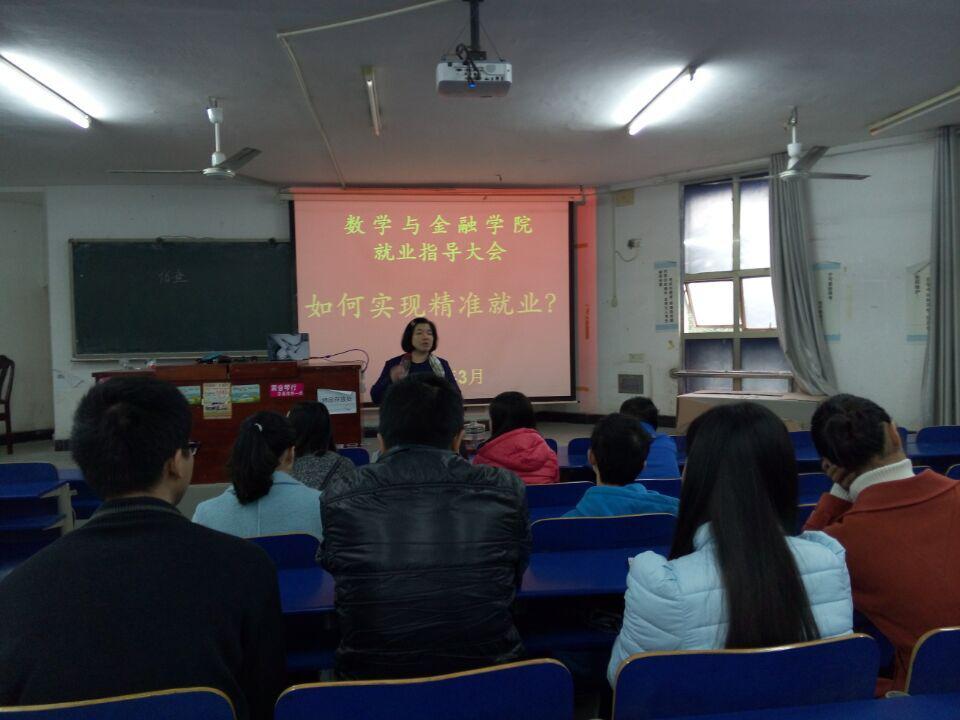 为进一步推动太阳成官网毕业生就业工作,帮助毕业生认清就业形势、熟悉就业政策、转变就业观念、增强择业意识,促进毕业生充分就业,3月30日上午9:00由数学与金融学院举办的毕业生就业指导大会在致远楼320教室成功举办。数学与金融学院院长陈国华、党总支书记高平、副书记周兰、就业专干陈芳以及全体16届毕业生参加了此次指导会。