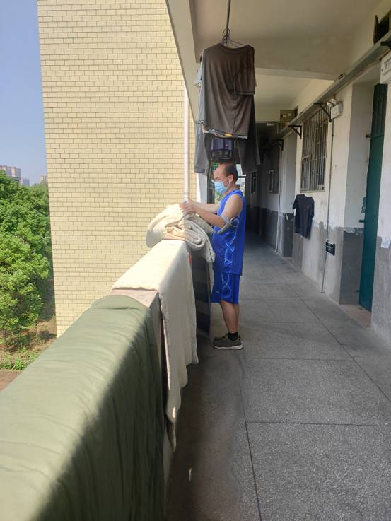 老师们按照被子上的编号,依次把被褥晾晒到学校专门准备的晾晒绳上,并认真寝室擦扫地面,擦拭书桌,整理桌面物品,将卫生死角打扫地干干净净。3天内56名老师共打扫了45间毕业生寝室。