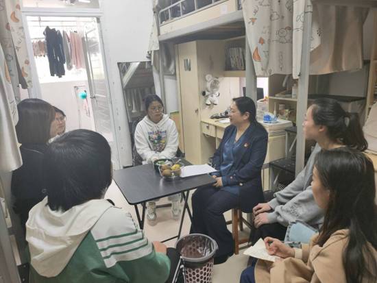 经过3月份的寝室走访和微信、电话联系,凌书记对女生8栋641寝室4名学生的基本情况了然于心。近一个小时的深入寝室走访,凌书记详细了解了近期大家的学习、生活以及五一假期安排情况,传达了学校关心学生就业、学习、生活等的帮扶政策,询问大家是否有明确的学业生涯规划目标,在生活学习中有没有遇到需要帮扶解决的问题,要求同学们坚持体育锻炼,提高身体素质,养成良好的作息习惯,并鼓励大家有困难可以随时向她报告。