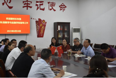 6月16日上午,党委委员、副校长朱强带领科研与社会服务处、计划财务处等部门同志到数学与金融学院开展调研,数学与金融学院班子成员、学科秘书及教授博士代表参加。