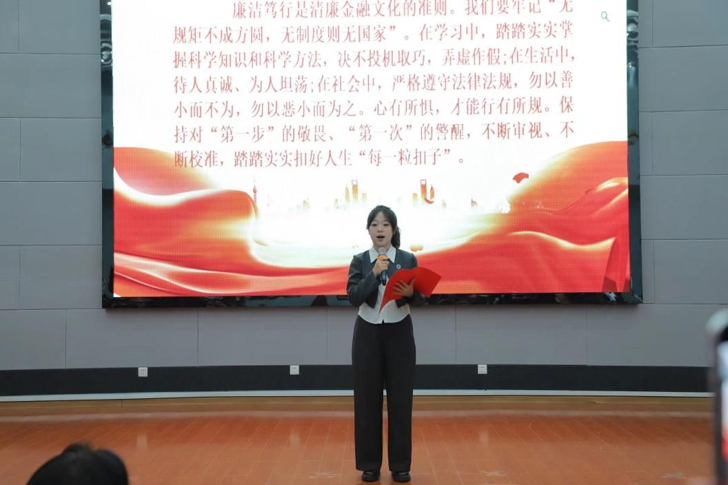 活动现场,数学与金融学院学生代表宣读了《清廉金融文化建设倡议书》,开展了《清风颂廉》主题朗诵。出席领导们向学生代表和银行保险机构代表赠送了《习近平与大学生朋友们》和《清廉金融文化读本》。中国银行娄底分行纪委书记韩强为在坐高校学子和银行保险机构从业人员开展了题为《廉洁从业第一课》清廉金融文化专题讲座。