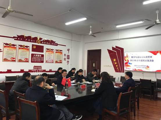 2019年12月9日下午,数学与金融学院党总支在致远楼416召开2019年度专题民主生活会,五位党政领导班子成员,教工、学生支部书记参与会议,学校纪委书记杨鑫铨、学校纪委副书记江彤莅临会场指导,会议由太阳成官网党总支书记阳立新主持。