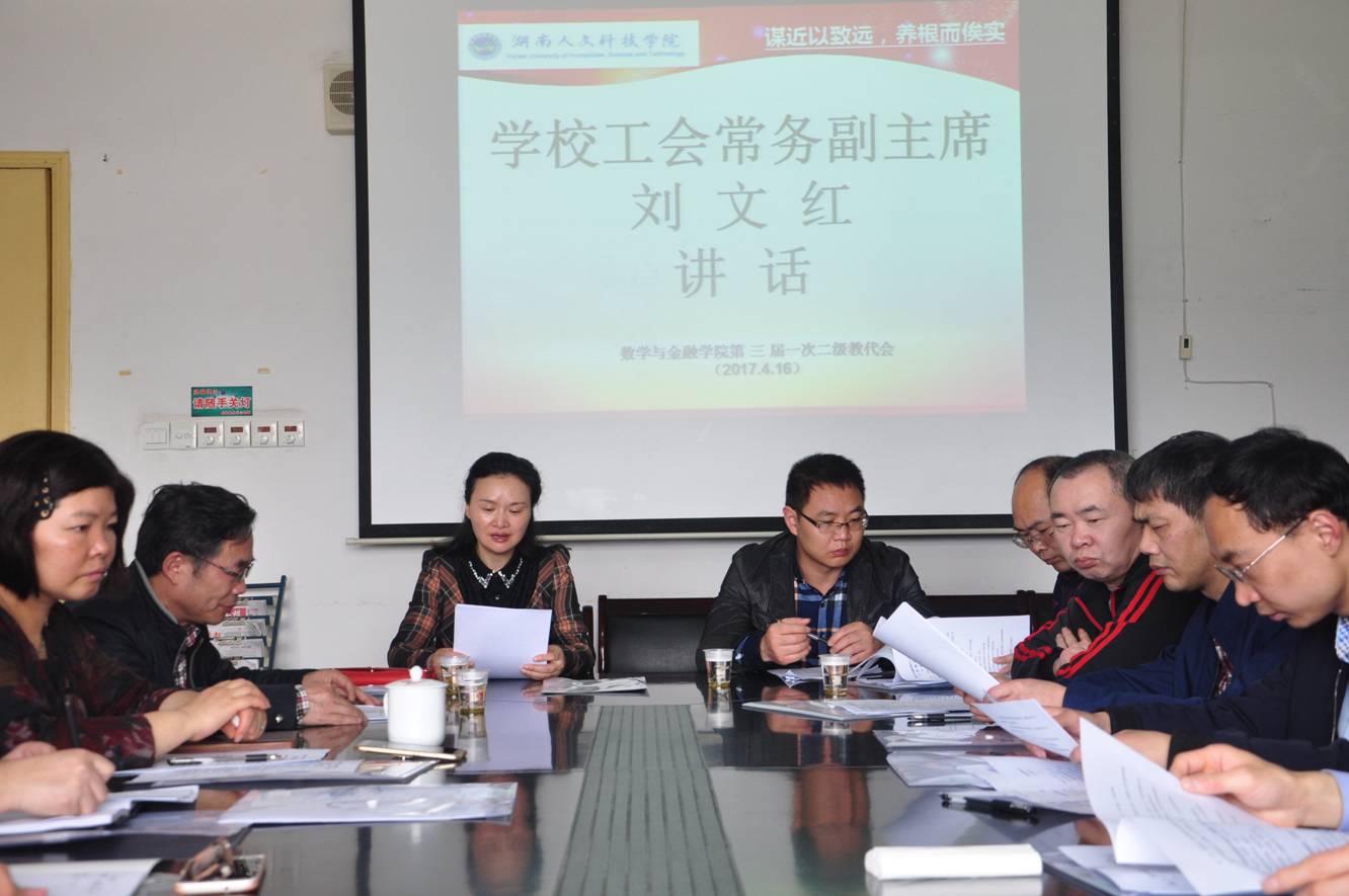 2017年4月16日上午8:30,44118太阳成城集团数学与金融学院在致远楼413室隆重召开了三届一次二级教代会,在庄严的国歌声中,三届一次二级教代会议拉开了序幕!