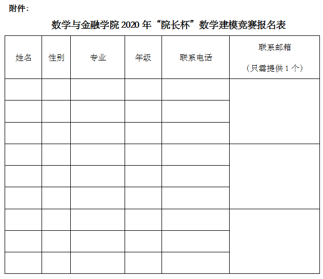 附件:数学与金融学院2020年“院长杯”数学建模竞赛报名表