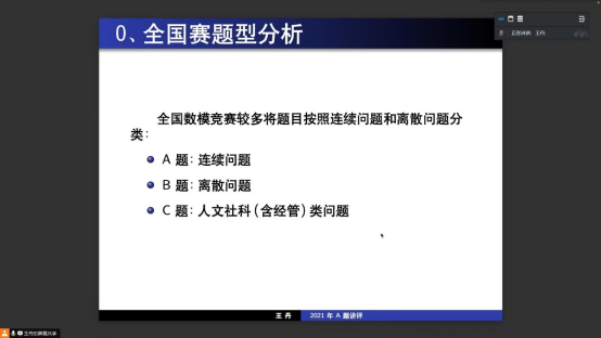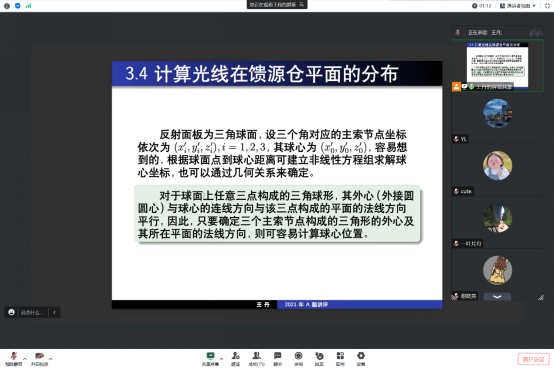 王丹首先结合历年数学建模赛题情况进行分析引入,紧接着从“赛题题型分析”、“赛题命题思路”、“赛题评阅总结”等三个方面的问题进行展开阐述。讲座中,王丹特别对2021年全国大学生数学建模竞赛A题“‘FAST’主动反射面的形状调节”的赛题概述分析、解题思路等方面对该题进行了全面的讲解,并从学生解题角度对赛题进行展开分析,对如何建好模型提出了实质性建议。进而强调应注重总结数学建模的方法、数学建模论文写作及团队成员间协作,赛前做好充分准备。讲座结束后,王丹热情地对同学们提出的问题进行详细解答。