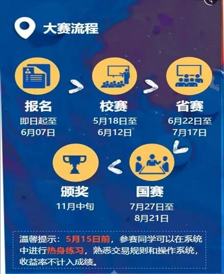 5)校赛综合收益排前30%的同学进入省赛,并参加2020年第六届东方财富杯全国大学生金融精英挑战赛培训。