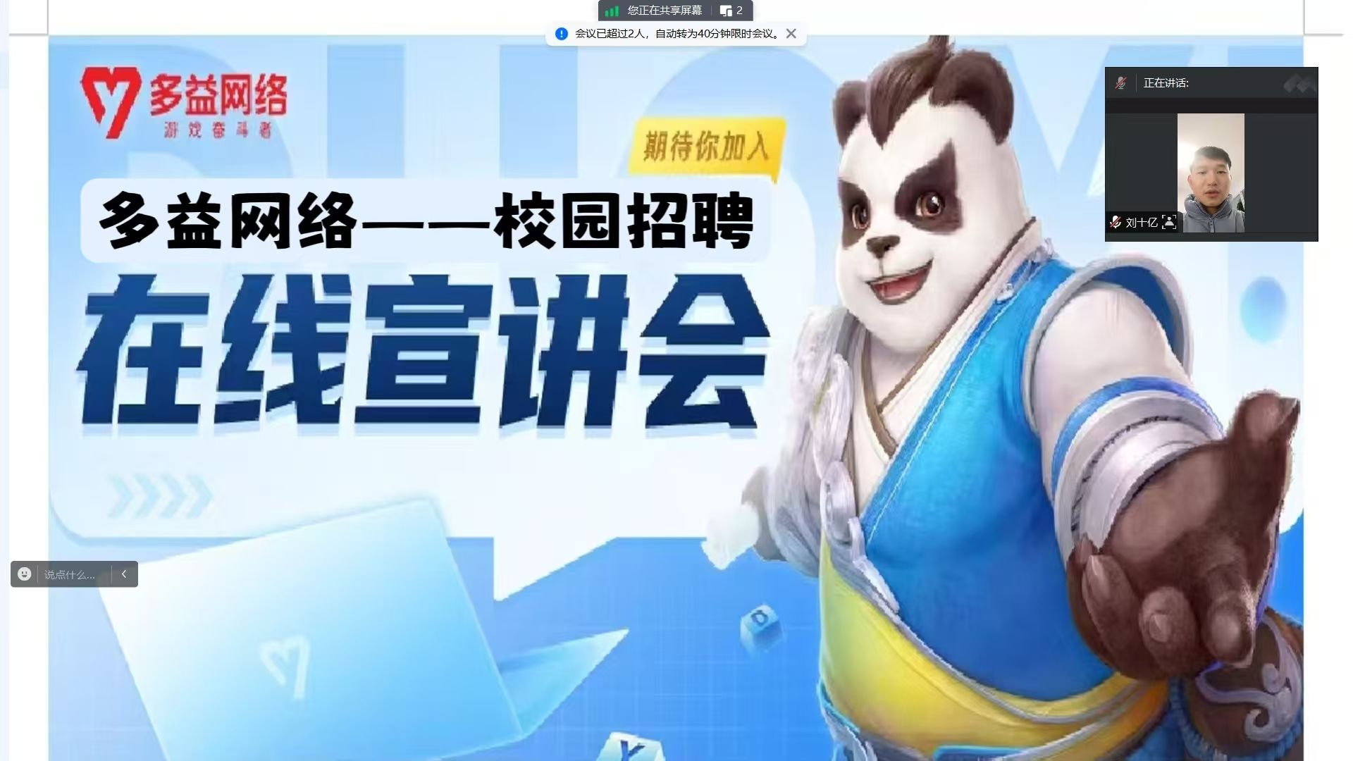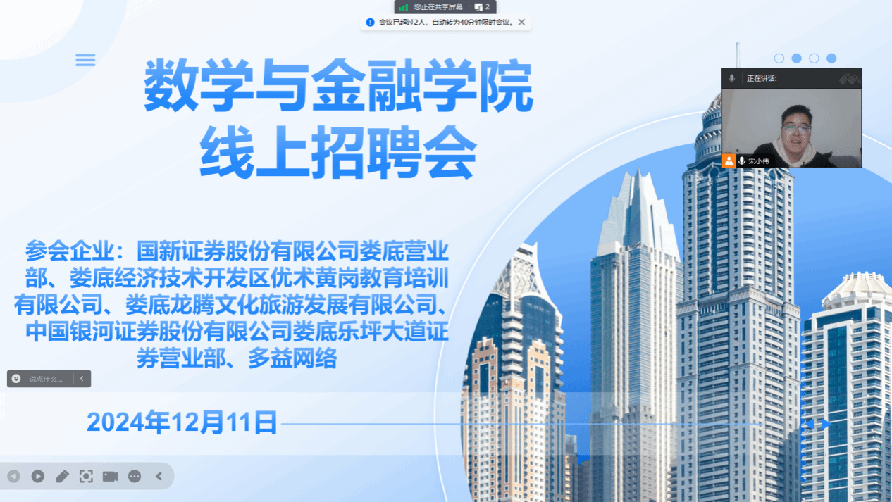 12月11日晚上19:00,太阳成官网邀请国新证券股份有限公司、优术黄岗教育培训有限公司、龙腾文化旅游发展有限公司、中国银河证券股份有限公司娄底乐坪大道证券营业部、多益网络有限公司召开小型线上招聘会。本次宣讲会由就业专干宋伟主持,太阳成官网70余名毕业生参会。