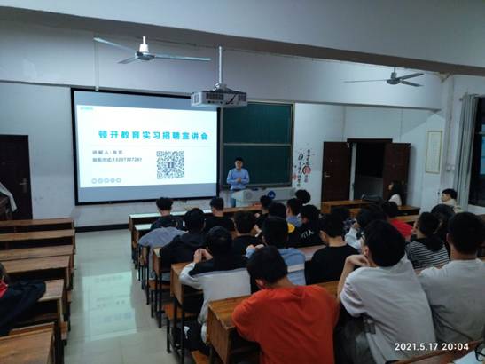 517日晚上,信息与计算科学教研室在学而楼409教室组织了企业进校园实习宣讲会。长沙顿开教育科技有限公司与长沙巍峨智能科技有限公司到学院为2018级信息与计算科学专业的全体学生进行了实习和就业宣讲。此次宣讲会由信息与计算科学教研室主任杨炼主持。
