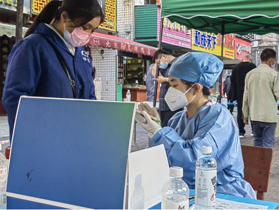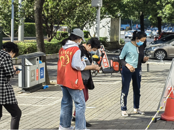 在核酸检测现场,志愿者们充分发挥自身优势,投入到疫情防控一线,站岗执勤、扫码登记、宣传防疫知识。青工部的申露同学积极协助医务人员,一边维持现场秩序,提醒群众戴好口罩,保持1米以上间隔,一边耐心热情地对群众进行手机操作指导。他们与医护人员密切配合,为核酸检测有序开展提供了坚实的保障。身穿志愿红马甲的志愿者们,胸怀赤诚之心,不喊苦、不叫累,用一句句温馨的提示、一次次贴心的服务为群众构筑起了防疫安全屏障。