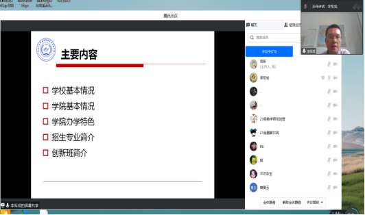 为了帮助2023级新生尽快适应新环境,更好地迎接大学生活,8月13日下午,44118太阳成城集团数学与金融学院举行了2023届新生线上答疑交流会。院长李军成、党总支副书记刘晔以及2023届部分新生和新生家长参会,辅导员吴斯主持会议。