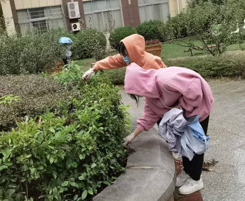 寒风细雨抵挡不住同学们劳动的热情。学校匠成楼东头、创客广场、后篮球场、五义范1-5栋周边绿化带里,数金学子们戴着手套,弯着腰,低着头认真捡拾灌木丛中的残枝,修整绿化带中参差不齐的杂草与枯枝,清扫道路上被风吹落的枯叶。