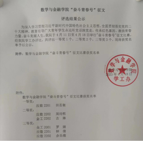 经学工办评选,应数2201班田若衡获得此次征文比赛一等奖;应数2202班周玲熙、金工2202班古琳获得二等奖;金工2001班罗婧、应数2201班钟倩和应数2202班佘乐维获得三等奖。