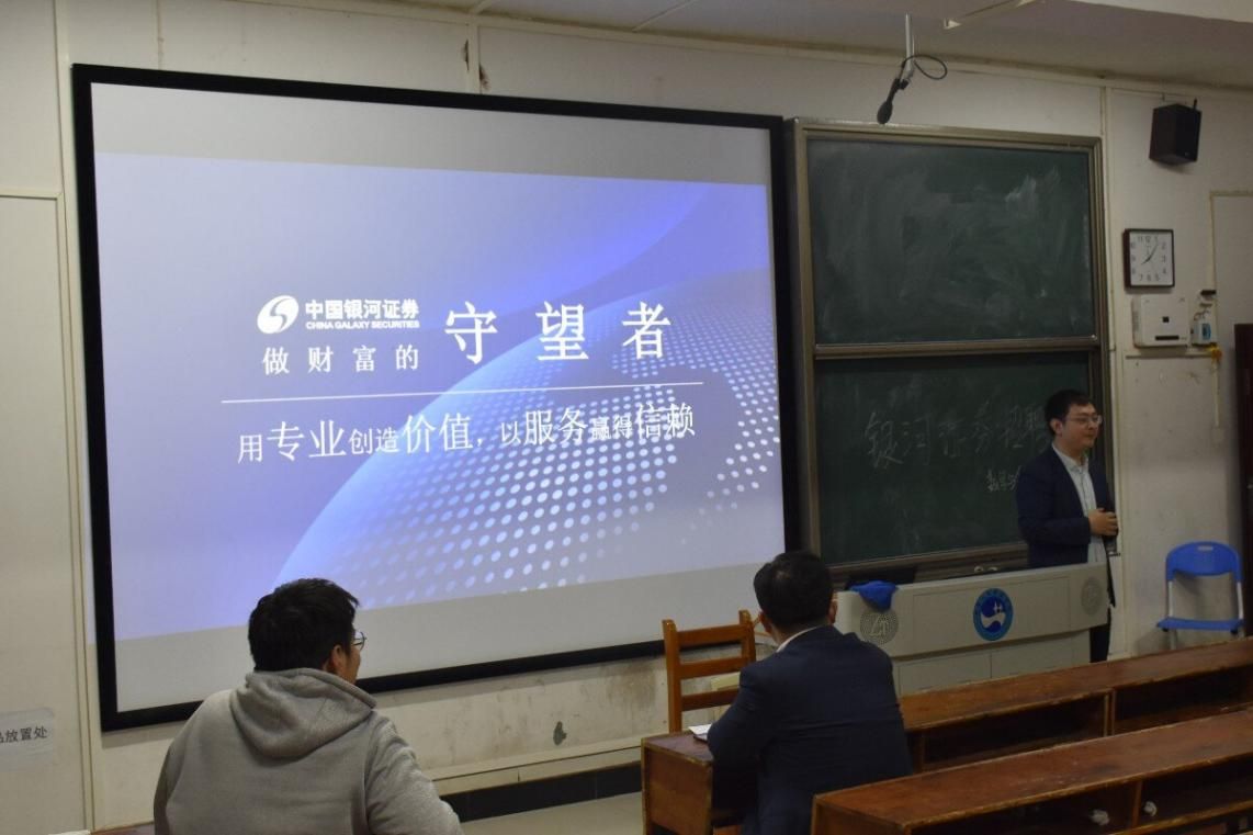 本次活动共分为三个部分。第一模块,中国银河证券招聘宣讲会。客户经理周海波对中国银河证券的发展历史、业务范围、组织架构等方面进行了细致的介绍,同时对中国银河证券娄底乐坪大道营业部本次的招聘信息作了详细说明,包括聘用岗位、待遇福利、培训晋升等诸多方面,同时解答了同学们关于证券行业与岗位方面的相关问题。